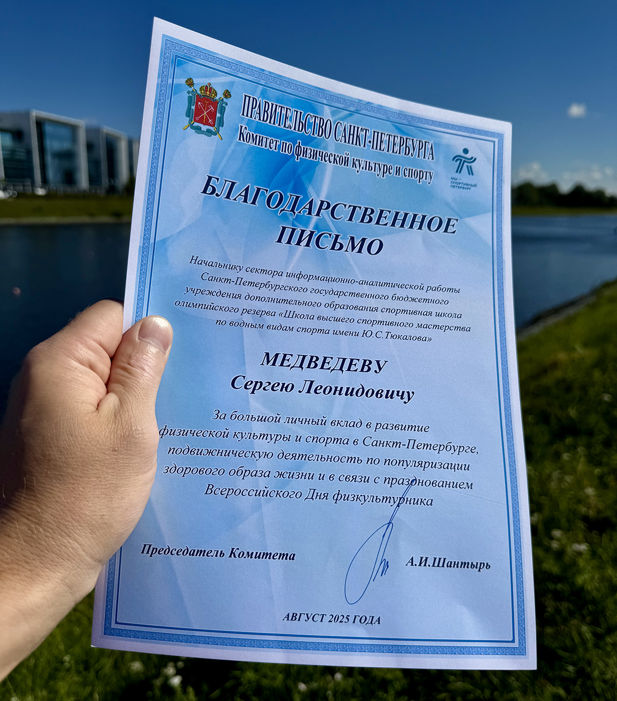 Сергею Медведеву сегодня была вручена Благодарность Комитета по физической культуре и спорту, что стало приятным моментом в его профессиональной карьере. Этот почетный диплом был вручён начальнику сектора информационно-аналитической работы Санкт-Петербургского государственного бюджетного учреждения дополнительного образования — спортивной школы олимпийского резерва "Школа высшего спортивного мастерства по водным видам спорта имени Ю.С. Тюкалова".